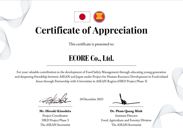 2023年12月食品・農林課ASEAN事務局より感謝状を頂きました。引き続きグローバルな食品衛生環境の構築を進めてまいります。