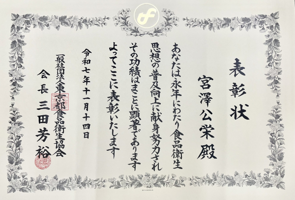 令和7年11月14日に東京都食品衛生協会より食品衛生厚労の表彰を頂きました。